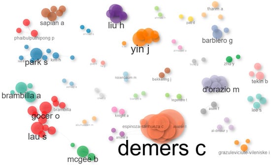 The author collaboration network in biophilic design research reveals a relatively fragmented structure, with multiple small clusters and limited large-scale collaboration (Figure 7). Demers C is the most prominent and central contributor, forming a dense cluster with collaborators such as Jean-François J, Lalonde J, and Parsaee M, indicating a strong, cohesive research group [,,,,]. Other visible clusters, such as those connected by red links, reflect regional or thematic partnerships but remain comparatively isolated.