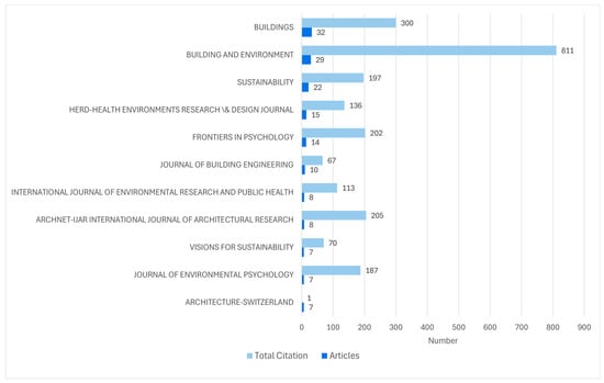 Figure 8 highlights the impact of publication volume and citations on key journals in biophilic design research. While Buildings leads in the number of publications (32 articles), Building and Environment stands out with the highest citation count (811), indicating strong influence and academic reach despite slightly fewer articles (29). Other journals, such as Sustainability, Frontiers in Psychology, and HERD contribute significantly both in volume and citations, reflecting the field’s interdisciplinary nature across environmental design, health, and psychology. This distribution suggests that impactful biophilic research is not only growing but also diversifying across multiple domains [].