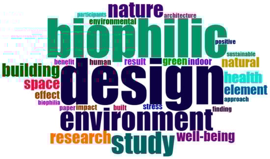 The keyword word cloud (Figure 9) shows that frequently used terms include “biophilic,” “design,” “environment,” and “nature,” reflecting a strong emphasis on human–nature connections in design. Health-related terms such as “well-being,” “stress,” and “impact” are also prominent, underlining the growing interest in measurable outcomes. Spatial and architectural concerns are reflected in words like “building” and “space,” while emerging themes such as “virtual reality” and “sustainability” suggest interdisciplinary convergence.