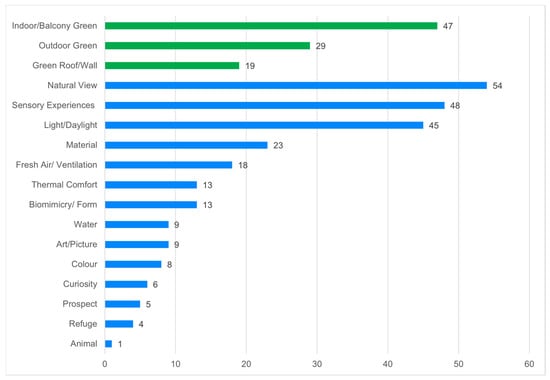 The coding categories were initially informed by established frameworks in the biophilic design literature, including Kellert et al. (2008) [] and Tekin et al. (2023) []. These were then refined inductively during a pilot coding phase involving a representative subset of publications, allowing us to ensure relevance, clarity, and coverage across diverse research contexts. The coding framework covered the following key dimensions (the data extraction tool, along with content subgroups, categories, and detailed descriptions, is provided in Supplementary Materials Table S2):