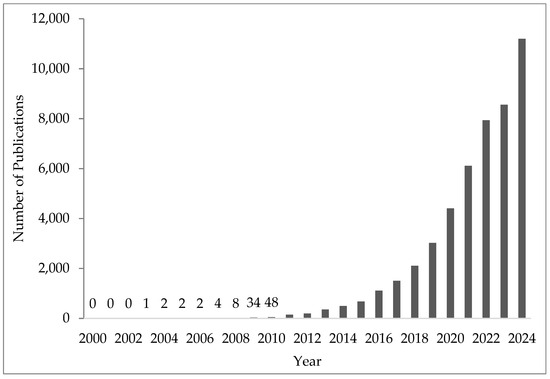 Bibliographic analysis can visualise the current surge in research on BC and its utilisation during the past two decades, aligning the direction of scientific research. Figure 1 shows the Science Direct database of research and review papers published from 2000 to 2024 for the keyword “BC.” The publication trend in Figure 1 clearly indicates that, until 2010, BC had not been explored for its potential in various applications and was largely regarded as waste. Currently, BC is being utilized across a wide range of fields, including agriculture, environmental remediation, energy production, climate change mitigation, and industrial manufacturing [27,28,29,30]. The research on BC started to increase after 2010, with a gradual increase till 2018. After 2018, a high volume of publications can be seen. Similarly, in 2024, there is a huge increase in the research, which is about a 30% increase compared to 2023. Additionally, in the last 5 years, the research focus has been observed in the “Engineering” and “Energy” fields. Despite the increase in research in these areas, there is much scope to explore the full potential of BC [31].