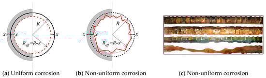 The average loss of the cross-sectional area in the case of uniform corrosion can be calculated if the corrosion penetration depth x is known (see Figure 1a). The original radius of the reinforcing bar is R, while the effective radius after corrosion is Reff = R − x. Consequently, the percentage of cross–sectional area loss α (also referred to as the corrosion level) can be calculated as follows [,,]: