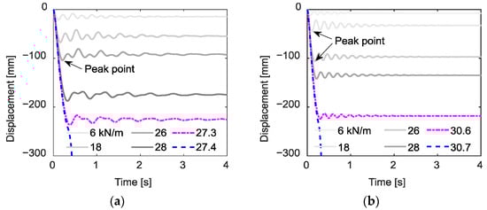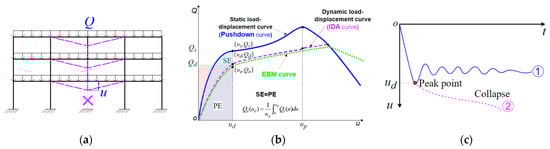 Although IDA is an accurate method for capturing dynamic structural responses, it is computationally intensive and relatively complex to implement [,,]. As an alternative, the energy-based method (EBM) [,,], which has been successfully applied in assessing the maximum dynamic response under sudden column loss scenarios [,,,], offers a simplified yet effective approach for determining the dynamic capacity curve and the approximate ultimate load-bearing capacity. The EBM is grounded in the principle of conservation of energy [,]; i.e., the strain energy equals the potential energy or SE = PE in Figure 2b at the moment of the peak point in the time–history displacement response in Figure 2c. Specifically, the area under the nonlinear pushdown curve (see Figure 2b) represents the energy absorbed by the structure under increasing downward loads. An approximate dynamic capacity curve (i.e., the EBM curve in Figure 2b) can then be estimated by dividing the accumulated stored energy at each displacement level by the corresponding displacement, according to the following expression [,,]: