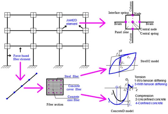 The software package OpenSees v3.7.1 [] is adopted to build finite element models of RC frame structures and to perform progressive analyses in the following sections. The force-based beam–column fiber element is employed to simulate the beam and column components []. The cross-section of the fiber element is discretized into fibers (Figure 3) which are subjected to a uniaxial stress state. Hence, different stress–strain relationships can be assigned to the different fibers. Eventually, the mechanical behavior of the section can be obtained by integrating the whole section [,]. Regarding beam-to-column connections, the Joint2D element (Figure 3) in OpenSees is adopted. The nonlinear shear behavior of the joints is determined by the modified compression-filed theory [,,]. Additionally, the co-rotational transformation is used to consider geometrical nonlinearity []. The uniaxial plastic damage model in OpenSees, i.e., the ConcreteD material [], is used for concrete fibers. The confinement effect caused by stirrups on the compressive behavior of concrete material is taken into account through the Mander model []; see curve 2 vs. curve 4 in Figure 3. The tension stiffening effect using the model by Stevens et al. [] is adopted, reflecting the effect of longitudinal reinforcement (curve 1 vs. curve 3 in Figure 3). The uniaxial Giuffre–Menegotto–Pinto steel material model, i.e., the Steel02 material model [,], is used for reinforcing steel (Figure 3). Furthermore, the Min–Max material is applied to the constitutive models to reflect material failure, such as reinforcement fracture and concrete crushing [,]. More details can be found in relevant references [,,,,].