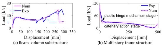 Two experimental specimens on the progressive collapse tests of RC frame structures under column removal conditions are employed. The first one is the specimen P2 tested by Qian et al. []. It is a RC beam–column substructure subjected to the middle column loss. The other experimental setup consists of a 1/3-scale RC frame structure with three stories and four bays subjected to the ground-floor middle column loss, as tested by Yi et al. []. Further details regarding the experimental tests, including the configurations, geometric dimensions, and material properties, can be found in the two associated references [,]. Following this, two distinct numerical models are constructed by applying the described modeling strategies in Figure 3. Using the same material parameters and loading procedures, corresponding progressive collapse analyses are conducted. Figure 4a shows the comparison of the numerical and the experimental curves of the concentrated load imposed on the structure against the vertical displacement at the mid-span, while Figure 4b shows the comparison of the numerical and the experimental curves of the load in the column against the vertical displacement at the top of the removed column. Despite slight discrepancies along certain portions of the curves, the numerical results show good agreement with the experimental data, demonstrating that both the compressive arch action and the tensile catenary action are accurately captured in the simulations. The effectiveness of the numerical modeling strategies is thus confirmed through a comparison with experimental results.