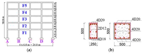 A five-story and four-bay RC frame [] designed in accordance with the Eurocodes [,] is considered in this work. As illustrated in Figure 5, the frame is representative of a typical structural unit in an office building. The first story has a height of 4.5 m, while the remaining four stories are each 3.6 m in height. Each bay spans 6.0 m, and the spacing between adjacent frames is also 6.0 m. Detailed cross-sectional dimensions and reinforcement layouts for beams and columns are provided in Figure 5b. Beams have a cross-section of 250 mm × 500 mm, and columns measure 500 mm × 500 mm. A concrete cover of 30 mm is applied to all structural elements. The characteristic dead load for both floor and roof slabs is assumed to be 5.0 kN/m2, while the corresponding live load is taken as 3.0 kN/m2 []. Column lines are labeled from left to right as A, B, C, D, and E (see Figure 5a).