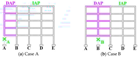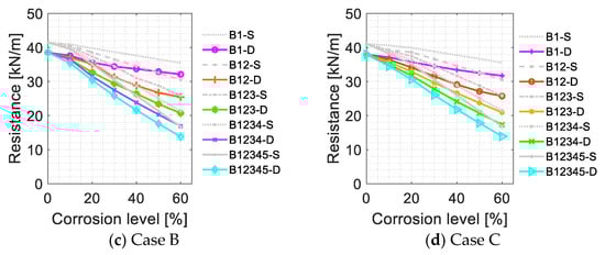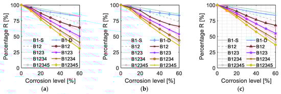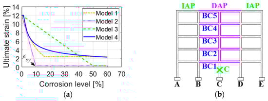 Two additional cases are further investigated: one in which only the beams located in the directly affected part (DAP) from the first to fifth floors (referred to as ‘DAP: B–12345’) are subjected to reinforcement corrosion and another in which both all the DAP beams and all columns (labeled as ‘DAP: B–12345 + C–ABCDE’) experience corrosion. As expected, the resulting resistance–corrosion-level curves for both cases are nearly identical to that of the ‘all’ scenario, as shown in Figure 9a.