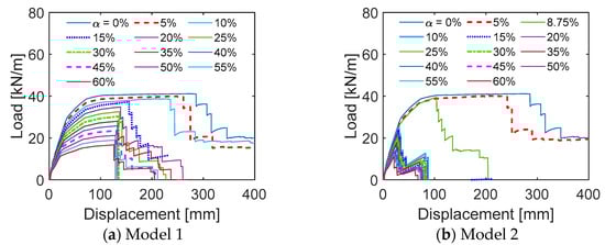 Model 3: Another value of αmax = 0.5 is obtained according to the experimental results of Cairns and Millard []. Note that Equation (4) is applied to Model 3 as well. Essentially, these two different values of αmax will result in quite different results, which will be discussed in detail in Section 4.2.