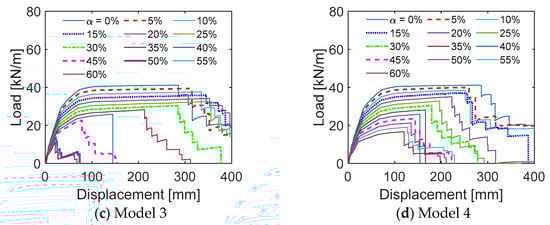 Compared to the abrupt reduction observed in Model 2 at α = 10% and in Model 3 at α = 45% (Figure 8a), the decrease in load-carrying capacity predicted by Models 1 and 4 is significantly more gradual. It can be attributed to the near-complete loss of ductility under these conditions by Models 2 and 3 (Figure 6a). This behavior is further supported by Models 1 and 4, where no significant acceleration in degradation is observed as the residual ductility remains relatively high (ɛsu,c/ɛsu ≥ 20%). Castel et al. [] conducted tensile tests on notched rebars and found that ductility decreases exponentially before stabilizing at approximately ɛsu,c/ɛsu = 25% of the initial value. Additionally, studies by other researchers [,] have shown that the load-carrying capacity of RC beams or frames typically decreases in a stable manner and may even follow a linear relationship with the loss of material due to corrosion. However, it is difficult to determine which model is the most realistic without further experimental validation. More extensive experimental evidence is required to interpret the results, particularly when assessing structural performance at higher corrosion levels.