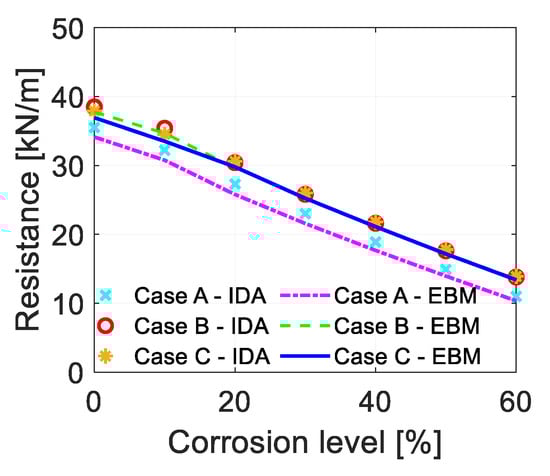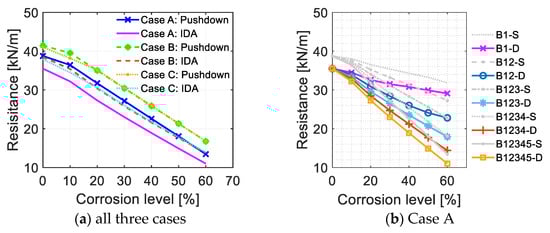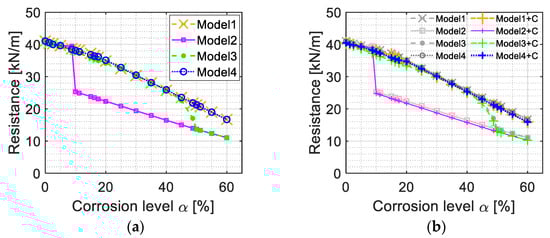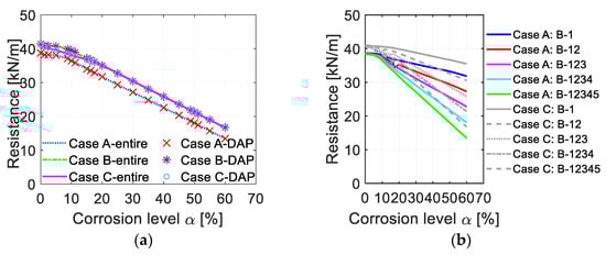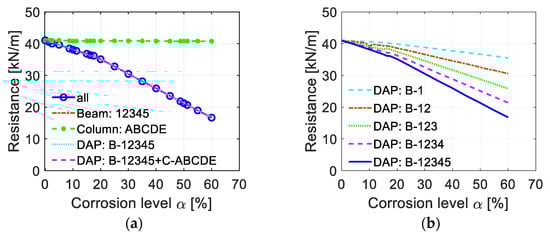 Results of resistance against corrosion level α: (a) corrosion in reinforcement and (b) influence of deteriorated concrete.