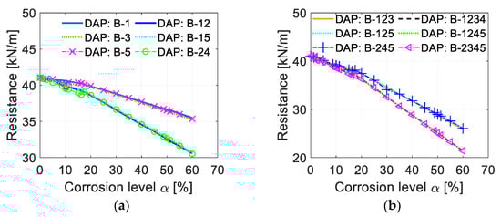 Results of resistance against corrosion level α: (a) any one or two floors in DAP and (b) any three or four floors in DAP.