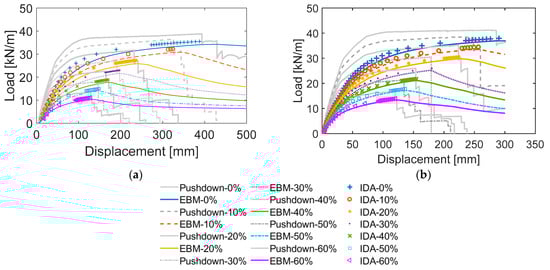 The four models are subsequently employed to conduct nonlinear static pushdown analyses (as described in Section 3.1), considering the removal of the central ground-floor column C (see Figure 6b). It is assumed that all beams and columns are exposed on four sides and that the reinforcements in both beams and columns are subjected to uniform corrosion. In the pushdown analysis, uniformly distributed vertical loads are gradually applied to all beams. A displacement-controlled procedure is adopted, with the vertical displacement at the top of the removed column C being controlled. The analyses are conducted by individually incorporating Models 1 to 4 to account for the reduction in steel ultimate strain, considering varying corrosion levels ranging from α = 0% to 60%. The displacement at the control point is recorded throughout the analysis, resulting in the pushdown curves presented in Figure 7. It can be observed that the static pushdown curves shift downward with increasing corrosion level. This trend is expected, as higher corrosion levels lead to greater reductions in the cross-sectional area, which significantly reduces the structural stiffness.
