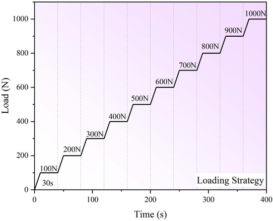 The method for determining effective thickness was carried out by the four-point bending test. The four-point bending test was performed using a universal test machine (CMT-5204, SUST, China). The supporting and loading spans were set at 1000 mm and 200 mm, respectively. Specimens were loaded at a loading speed of 10 N/s. The four-point bending test was non-destructive, and the loading protocol terminated when reaching 1000 N maximum load (well below fracture thresholds). The loading protocol was carried out by multi-stage loading sequences. The loading sequence was from 100 N to 1000 N with incremental 100 N steps, and each loading step was maintained constant for 30 s. The loading protocol is shown in Figure 1. This loading strategy could ensure linear elastic response while easing viscoelastic effects, thereby enhancing measurement accuracy.