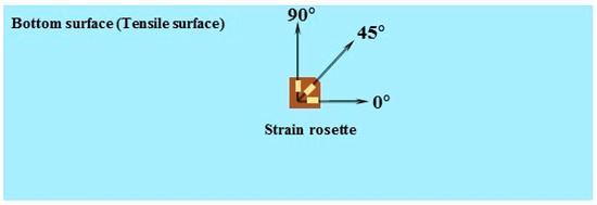Schematic diagram of strain rosette installation on the bottom surface of the bottom ply of the composite glass.