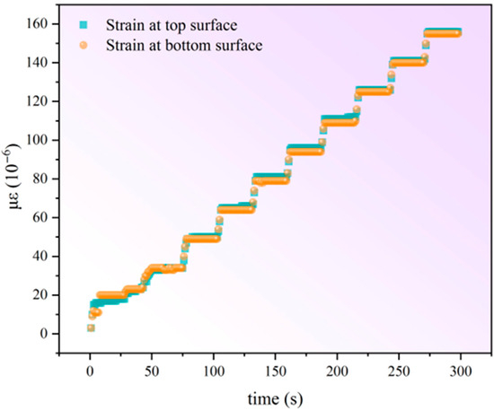 Strain rosettes with three measuring grids arranged at directions of 0°/45°/90° were used to collect the strain values at each loading step. The strain rosettes were installed at the bottom surface (tensile surface) of the bottom glass ply of the composite glass to capture the maximum bending strain. The schematic diagram of the stain rosettes installation is illustrated in Figure 2. A static strain acquisition system (JM3812, JingMing Technology, Guangzhou, China) was used to connect with strain rosettes, recording the measurements. To verify that the mechanical response is predominantly bending, a complementary strain gauge was also installed on the top surface (compressive surface) of the glass. The photo of the actual specimen installed with two strain gauges is shown in Figure 3. Strain symmetry was confirmed through equal-magnitude opposite-sign readings from opposing surfaces, shown in Figure 4, validating the bending response. Alternatively, if there is only one strain gauge, the specimens can be tested twice under identical conditions, swapping the upper and lower surfaces to collect the strain signals from both sides and comparing the values to ensure bending response.
