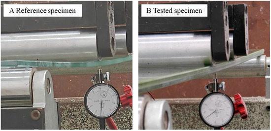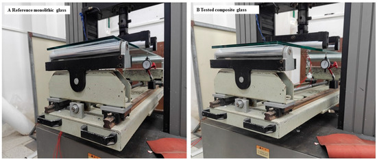 where ε0 is the strain at 0°, ε45 is the strain at 45°. ε90 is the strain at 90°. E is the elastic modulus of glass (~72 GPa). μ is the Poisson’s ratio of glass (~0.24) [16]. Using the bending stress in each loading step plotted the diagram of stress against load. Within the linear elastic range, identical load magnitudes were matched between monolithic and composite specimens. Corresponding stress equivalence thus enabled the determination of the composite glass effective thickness. The close-up of the reference and tested specimens as prepared for the four-point bending test is shown in Figure 5. The documented photos of reference and tested specimens with obvious deflection are shown in Figure 6.