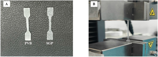 (A) The dumbbell-shaped PVB and SGP specimens. (B) The tensile loading process.