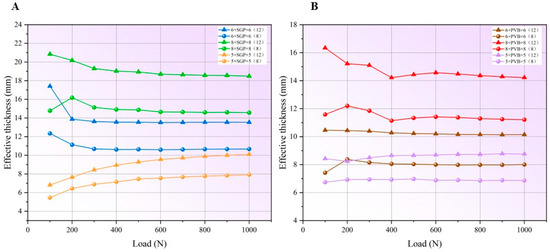 The effective thickness of polymeric laminated glass determined by the proposed method at each loading step. (A) SGP laminated glass. (B) PVB laminated glass.