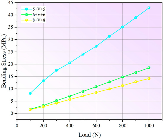 As established in Equation (5), experimental bending stress can be determined from strain values measured at the maximum strain point of specimens. The theoretical bending stress of composite glass is calculated by substituting the nominal thickness with the experimentally determined effective thickness, as presented in Equation (12). This theoretical framework enables validation of the effective thickness determination method through direct comparison between experimental and calculated bending stresses at identical loading levels.