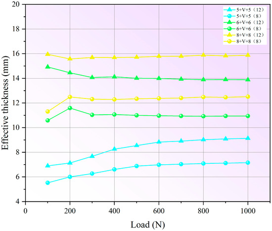 The bending stress at each loading step of vacuum glazing with different thicknesses of glass is demonstrated in Figure 10. As shown in Figure 10, vacuum glazing exhibited decreasing bending stress with increasing glass thickness, which showed a similar trend to PVB and SGP laminated glass. Notably, vacuum glazing demonstrated comparable bending stress to SGP laminated glass under identical loading conditions, while showing lower stress values than PVB laminated glass. The effective thickness of vacuum glazing determined using different reference glasses is shown in Figure 11, where the previously observed phenomenon is confirmed, that the effective thickness values derived from the initial loading stage display marked divergence.