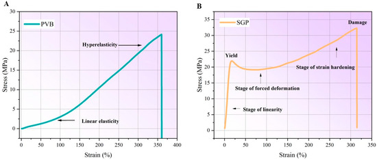 The plot of stress against strain of PVB and SGP under tensile loading. (A) The tensile response of PVB interlayer; (B) The tensile response of SGP interlayer.