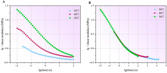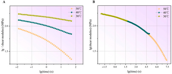 Frequency sweep tests were performed to analyze the time-dependent properties. The logarithm of shear modulus of PVB and SGP against the logarithm of time at different temperatures is shown in Figure 13A and Figure 14A, respectively. These curves can be superimposed using appropriate shift factors to establish a master curve. The derived master curve enables to extent of the time regime at a specific temperature [23]. Notably, the master curves of PVB and SGP are shown in Figure 13B and Figure 14B. There were significant differences in the trend of shear modulus evolution between PVB and SGP over the extended time scales.