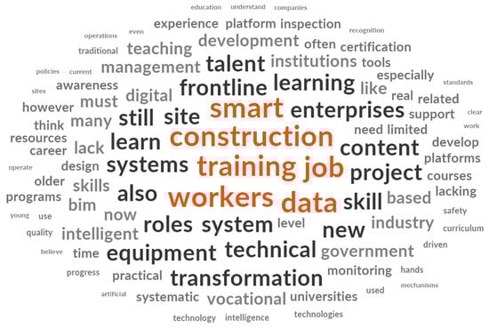 Word Frequency, one of NVivo’s analytical tools, was helpful in illustrating the most common words used by respondents, which allowed the authors to quickly and intuitively grasp the prominent ideas during the interviews []. In this study, the most frequently used words were construction, smart, worker, training, job, and data. In addition to these, other important words included talent, frontline, transformation, technical, and skill (see Figure 1).