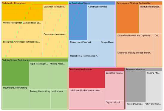 In Figure 2, the key themes extrapolated from the treemap chart are presented, alongside a visual representation of this information. These themes serve as a potential bridge between theoretical conceptualization and empirical reality. They help explore strategic pathways for constructively developing the construction workforce, supporting both transformational leaps in capability and the incremental adjustments needed as the industry navigates the evolving AI paradigm.