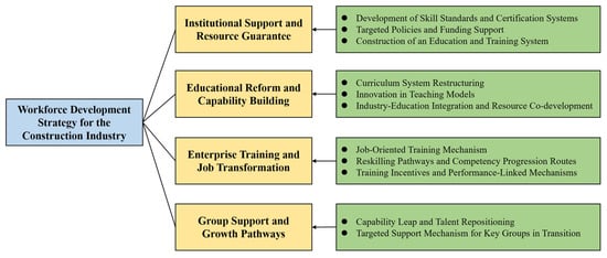 Indeed, AI-driven construction skill structure transformation has shifted workforce development from traditional single-supply models toward multi-centre collaborative governance systems [], as individual entities cannot independently address systematic restructuring challenges. Governments function as institutional architects, advancing workforce development through policy guidance, occupational standard setting, and fiscal subsidies []. Enterprises serve as both technology demand drivers and job suppliers, playing crucial roles in position restructuring and employee training []. Educational institutions bear responsibility for talent pipeline development and knowledge system construction, increasingly expected to drive curriculum reform, build interdisciplinary competency models, and strengthen industry integration [].