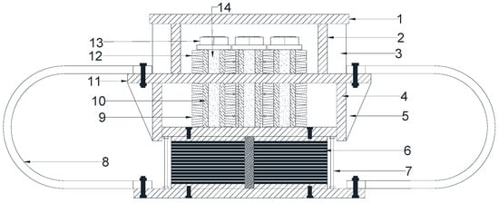 Structural configuration of 3D bearing. 1–Upper plate; 2–Upper sleeve; 3–Stiffeners for upper sleeve; 4–Lower sleeve; 5–Stiffeners for lower sleeve; 6–LRB; 7–Wire rope; 8–U-shaped damper; 9–Disc spring group 2; 10–Supporting shaft; 11–Middle plate; 12–Disc spring group 1; 13–Hexagon nut; 14– High-strength cement mortar.