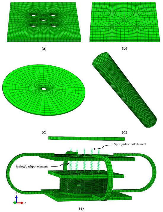 Finite element model of bearing. (a) Middle plate; (b) Upper connection plate of LRB; (c) Rubber layer of LRB; (d) Lead core of LRB; (e) Complete FE model.