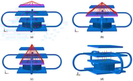 Secondly, five MPC beam constraints were established on the upper connection plate of the LRB to simulate the disc spring shafts, as shown in Figure 3d. Ten reference points were defined at the center positions of the holes on the upper and lower surfaces of the middle plate to assign the spring elements. Among these, the upper five reference points serve as the lower nodes of the upper five spring elements, and the lower five reference points act as the upper nodes of the lower five spring elements. Each reference point is coupled with the annular region within a 70 mm radius around the corresponding hole on the upper and lower surfaces of the middle plate.