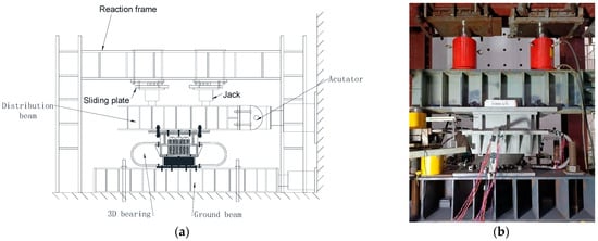 Experimental setup and typical photograph: (a) Experimental setup; (b) Typical compression—shear test at 100% strain level under vertical load of 1000 kN.