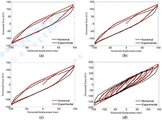 Experimental and numerical horizontal hysteretic curves: (a) Under vertical load of 1000 kN; (b) Under vertical load of 1200 kN; (c) Under vertical load of 1500 kN; (d) At five shear strain levels: 50%, 75%, 100%, 125%, 150% under vertical load of 1000 kN.