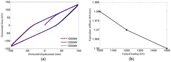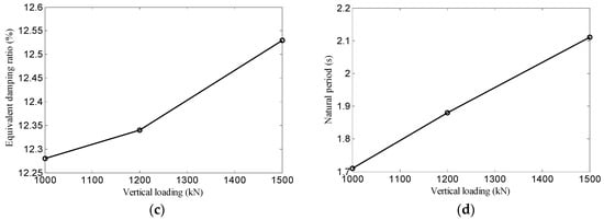 Figure 6a presents the horizontal hysteretic curves of the bearing under different vertical loads. It can be observed that the variations in vertical loading result in minimal differences in the horizontal load–displacement characteristics, indicating that the bearing’s horizontal hysteresis performance is not significantly affected by changes in the vertical load. This behavior is primarily due to the near-incompressibility of rubber and the reciprocating plastic shear deformation of the lead core. As the vertical load increases, the equivalent horizontal stiffness of the bearing exhibits a decreasing trend, as illustrated in Figure 6b. Regarding the horizontal equivalent damping ratio of LRBs, previous studies have indicated that when the pressure is below 10 MPa, the damping ratio increases linearly with pressure, while for pressures up to 15 MPa, the increase becomes nonlinear [,]. As shown in Figure 6c, the equivalent damping ratio increases with compressive stress, although the variation remains relatively small. This observation aligns with findings reported for LRBs. The natural period is closely related to the equivalent stiffness and is inversely proportional to the square root of the equivalent stiffness when the vertical load is constant. Consequently, its variation trend is evident, as demonstrated in Figure 6d.