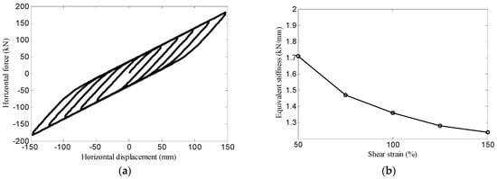 As shown in Figure 7a, under moderate shear strain conditions, the load–displacement curve of the bearing exhibits a fusiform shape without pinching or noticeable degradation in strength and stiffness. This phenomenon can be attributed to the contribution of the U-shaped dampers. Figure 7b illustrates that with increase in the shear strain, the equivalent horizontal stiffness of the bearing shows a decreasing trend. The reason is that the rubber molecular chains gradually untangle and align directionally, leading to softening, and the lead core constantly loses its ability to contribute stiffness. Figure 7c presents the variation law that as the shear strain changes from 50% to 150%, the equivalent damping ratio of the bearing changes from 12.06% to the maximum value of 13.27% when the shear strain is 75%, and then continuously decreases to 10.38%. This trend can be explained such that as the shear strain increases, the rubber, lead core, and U-shaped dampers transition from the elastic stage to the plastic stage and subsequently enter the hardening stage. This process initially leads to an increase in energy dissipation capacity, followed by a subsequent decrease.