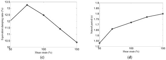 Horizontal performance of bearing under different shear strains. (a) Hysteretic curve; (b) Equivalent stiffness; (c) Equivalent damping ratio; (d) Natural period.