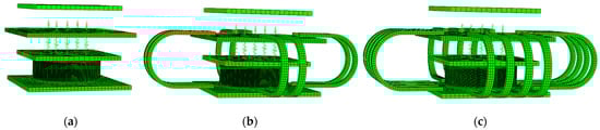 To establish a reliable finite element model, two key factors must be carefully considered in addition to employing accurate material constitutive models: first, the appropriate simplification of model components and the interaction mechanics between them; second, achieving an optimal balance between element mesh densities and computational efficiency [,]. The finite element model of the bearing is developed using ABAQUS (version 6.12) []. Based on the structural configuration and experimental observations of the bearings, the deformation of the bearings is mainly concentrated in the LRB, disc springs, and U-shaped dampers. Consequently, this study excluded non-critical components, namely, the supporting shafts, the upper and lower sleeves, as well as the corresponding stiffening ribs, from the finite element model to enhance computational efficiency and convergence performance. The functional roles of these components will be elaborated in the subsequent section.