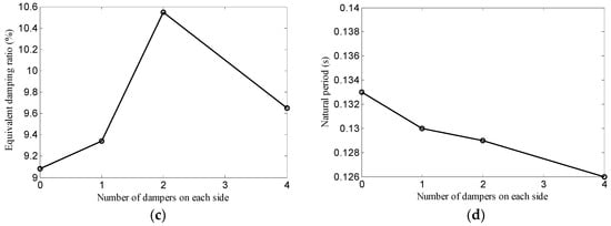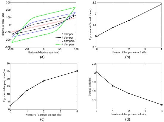 Horizontal Performance of bearing with different numbers of U-shaped dampers. (a) Hysteretic curves; (b) Equivalent stiffness; (c) Equivalent damping ratio; (d) Natural period.