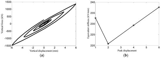 Figure 10a displays the vertical hysteretic curve of the bearing, which exhibits a pronounced asymmetry. This characteristic arises since when the bearing is under tension, only spring group 1 is compressed, and when the bearing is under compression only spring group 2 is compressed. Moreover, spring group 1 and spring group 2 have different compressive stiffness. As shown in Figure 10b, with increasing amplitude of the tension–compression cycles, the equivalent stiffness of the bearing initially decreases and then increases. This phenomenon can be attributed to the transition of the rubber and lead core from the elastic phase to the yielding phase, combined with the hardening effect exhibited by the U-shaped dampers under large displacements. For similar reasons, the energy dissipation capacity in the vertical direction first increases and then decreases, as illustrated in Figure 10c.