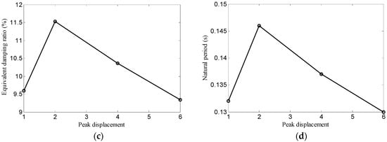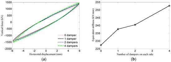 Figure 9 presents the horizontal behaviors of the 3D bearings with varying numbers of U-shaped dampers. It can be observed that as the number of U-shaped dampers increases, the energy dissipation capacity, equivalent horizontal stiffness, and equivalent damping ratio of the bearing all increase. Therefore, the U-shaped damper significantly enhances the horizontal isolation performance of the bearing discussed in this study. Notably, considering that the lead core diameter (30 mm) used in this bearing is considerably smaller than that of conventional lead rubber bearings (LRBs), the energy dissipation capacity of the bearing without U-shaped dampers is markedly limited in the horizontal direction, as demonstrated in Figure 9a. It is obvious that the addition of U-shaped dampers can partially substitute for the lead core. In this way, not only is the energy dissipation capacity of the bearing effectively improved, but also an environmentally sustainable design objective is achieved.