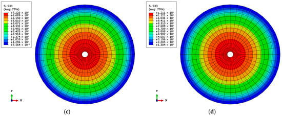 Figure 12 shows the stress distributions of the inner rubber layers at different positive peak displacements of the tension–compression cyclic loading process of the bearing. It can be seen that the stress distribution has obvious symmetry, that is, the stress is the greatest at the center and gradually decreases along the radial direction. To precisely control the tensile stress on the rubber layer, careful design is needed.