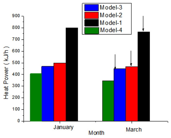 - The heating power demand of Model 4 was 400 kJ/h in January and 300 kJ/h in March, representing a 50% reduction compared to Model 1 (800 kJ/h in January).