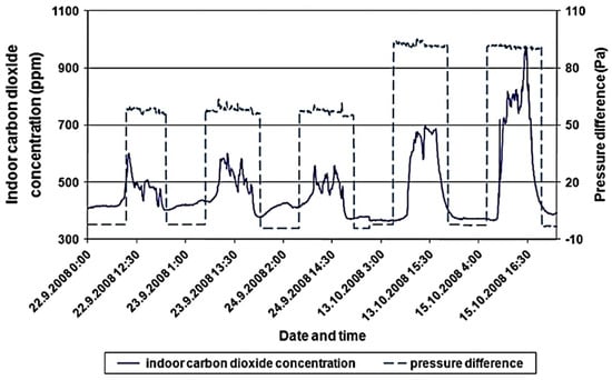CO2 content and pressure differential between the room and return air vent were measured inside [27].