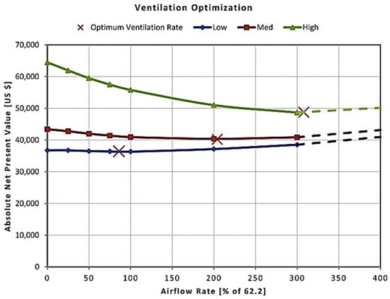 In 2013, Turner et al. [28] demonstrated that implementing residential whole-house ventilation systems in accordance with California’s Title 24 standards [29] can yield multiple benefits. Simulation studies were conducted to evaluate both occupant health outcomes and energy consumption in scenarios where whole-house ventilation systems were either properly or improperly functioning. The impacts on energy use and IAQ were assessed separately and compared using time-dependent valuation (TDV) for energy and disability-adjusted life years (DALY) for IAQ. Regardless of house size or climatic conditions, the study emphasized that health benefits were the most significant outcome. The authors argued that the net present value (NPV) of both energy savings and improved IAQ should serve as the primary criterion when selecting whole-house ventilation systems. As illustrated in Figure 3, binomial response curves show how outcomes vary with increasing ventilation rates, particularly beyond 300% of the ASHRAE 62.2 standard [30]. At higher ventilation levels, the NPV begins to decline due to the diminishing marginal benefit from further reductions in indoor contaminant concentrations.