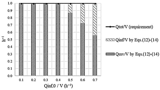 Shi and Li (2018) [31] developed theoretical models describing how increases in mechanical ventilation influence infiltration rates. They derived equations that relate infiltration rates to mechanical ventilation under both stack effect and wind-driven ventilation conditions. The theoretical framework was validated through experimental testing conducted in controlled room environments. Figure 4 illustrates the relationship between mechanical ventilation and various levels of building airtightness. Air exchange rates (ACH) are expressed in air changes per hour (h−1), defined as the airflow rate divided by the volume of the room. As shown in Figure 4, when initial infiltration exceeds 0.5 h−1, mechanical ventilation accounts for less than 55% of the total required airflow.