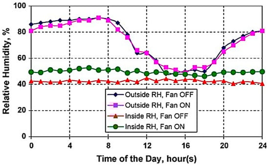 Hourly differences in interior and outdoor relative humidity during the “fan OFF” (August 14) and “fan ON” (August 18) periods [38].