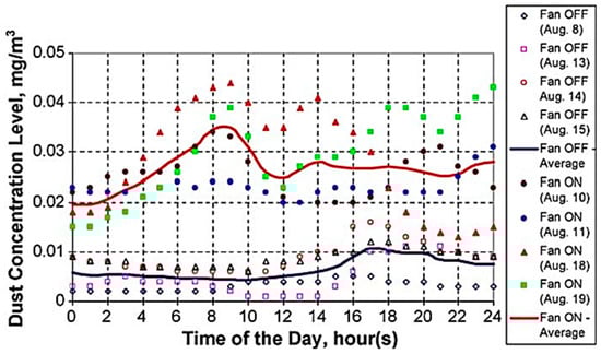 Hourly differences in the concentrations of interior dust between the “fan OFF” and “fan ON” periods [38].