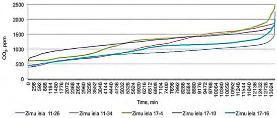 CO2 level cumulative graph for two Zirnu Iela 11 apartments and three Zirnu Iela 17 apartments [40].