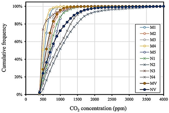 Zhao et al. (2018) [41] investigated the effects of both mechanical and natural ventilation on indoor temperature and humidity levels. The study was conducted in Urumqi, China, a region known for its extremely cold winters, and involved nine residential houses. Four houses utilized natural ventilation, four were equipped with heat-recovery mechanical systems, and one relied solely on mechanical ventilation. The results indicated that while Urumqi experiences dry indoor air during winter, indoor humidity becomes more comfortable during the rest of the year. Operation of mechanical ventilation systems in winter led to a 3% reduction in relative humidity and a 1.6 °C decrease in indoor temperature. As a result, residents were more likely to notice the dryness and respond by using humidifiers. Notably, indoor carbon dioxide levels remained below the regulatory limits. Figure 9 illustrates CO2 concentration levels in bedrooms during winter. More than 74% of the data showed that the indoor CO2 concentration in building N3 remained below 500 ppm, suggesting that the space was infrequently occupied. In contrast, in winter, bedrooms ventilated by MEV exceeded 1000 ppm CO2 in 4% of the recorded instances, while naturally ventilated (NV) bedrooms surpassed this threshold in 28% of measurements.